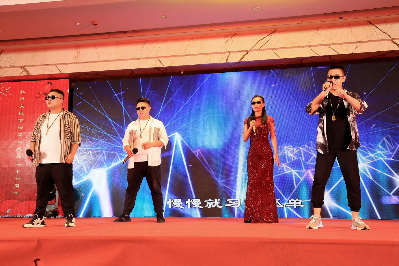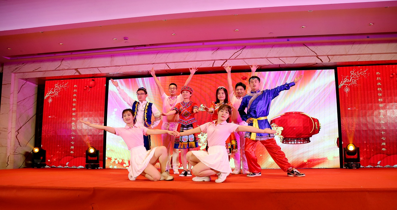 此次慶典晚宴參加人員除了信橋全體員工之外,還有部分老領(lǐng)導(dǎo)和老朋友,大家共同分享了信橋二十七周年的喜悅與精彩。八號(hào)上午,慶典開始之前,演員們辛勤排練,燈光師、音響師共同配合,所有人為了晚會(huì)都在努力。下午4點(diǎn)58分,晚會(huì)正式開始,全體員工與領(lǐng)導(dǎo)集體合影,信橋隊(duì)伍不斷在擴(kuò)大。今年的晚會(huì)添加新的互動(dòng)方式,采用了直播和紅包雨的新形式,是信橋周年慶典的一次新的嘗試。